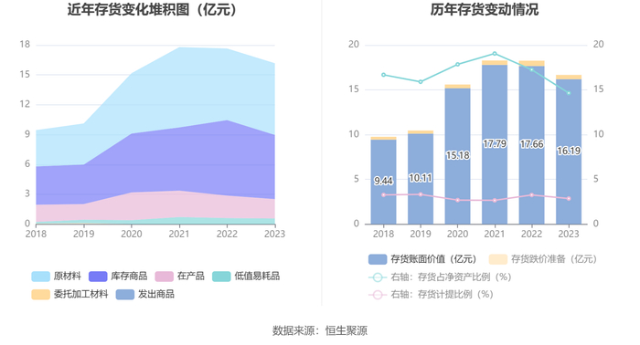 从存货变动来看,截至2023年年末,公司存货账面价值为16.19亿元,占净资产的14.65%,较上年末减少1.47亿元。其中,存货跌价准备为4769.71万元,计提比例为2.86%。