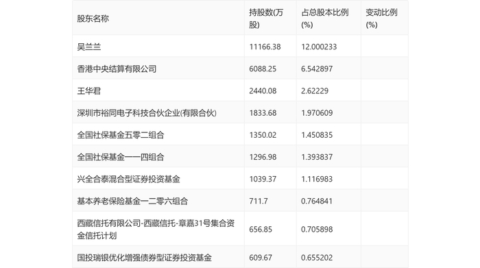 年报显示,2023年年末公司十大流通股东中,持股最多的为吴兰兰,占比12.00%。十大流通股东名单相比2023年三季报维持不变。在具体持股比例上,香港中央结算有限公司、全国社保基金五零二组合、兴全合泰混合型证券投资基金持股有所上升,基本养老保险基金一二零六组合、国投瑞银优化增强债券型证券投资基金持股有所下降。