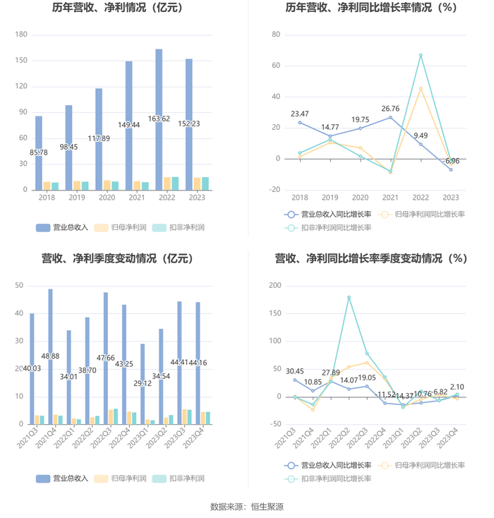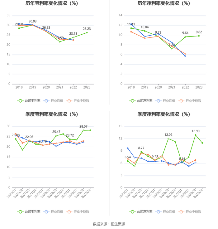 2023年,公司毛利率为26.23%,同比上升2.48个百分点;净利率为9.82%,较上年同期上升0.18个百分点。从单季度指标来看,2023年第四季度公司毛利率为28.14%,同比上升1.85个百分点,环比上升0.07个百分点;净利率为10.95%,较上年同期下降0.35个百分点,较上一季度下降1.95个百分点。