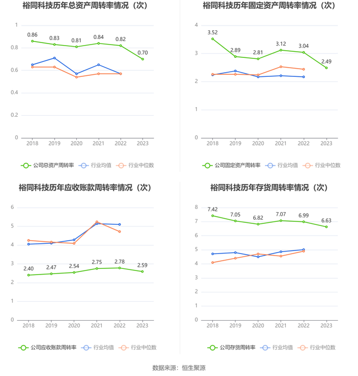 营运能力方面,2023年,公司公司总资产周转率为0.70次,上年同期为0.82次(2022年行业平均值为0.57次,公司位居同行业6/21);固定资产周转率为2.49次,上年同期为3.04次(2022年行业平均值为2.17次,公司位居同行业6/21);公司应收账款周转率、存货周转率分别为2.59次、6.63次。