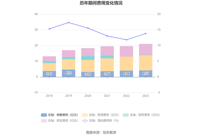2023年,公司期间费用为21.11亿元,较上年同期增加1.71亿元;期间费用率为13.87%,较上年同期上升2.01个百分点。其中,销售费用同比增长3.28%,管理费用同比增长8.97%,研发费用同比增长3.66%,财务费用由去年同期的-2537.86万元变为2774.27万元。