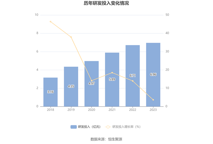 2023年全年,公司研发投入金额为6.96亿元,同比增长3.66%;研发投入占营业收入比例为4.57%,相比上年同期上升0.47个百分点。此外,公司全年研发投入资本化率为0。