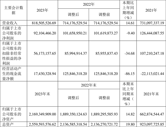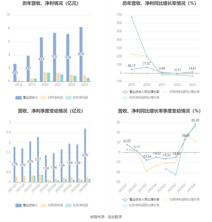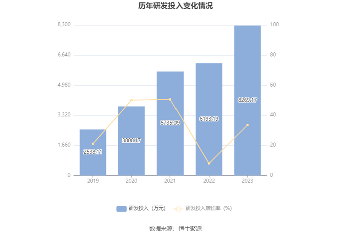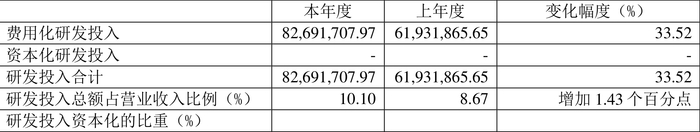 2023年全年,公司研发投入金额为8269.17万元,同比增长33.52%;研发投入占营业收入比例为10.10%,相比上年同期上升1.43个百分点。