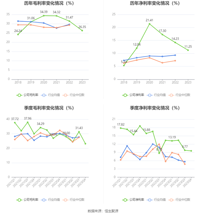 2023年,公司毛利率为26.35%,同比下降5.12个百分点;净利率为11.25%,较上年同期下降2.98个百分点。从单季度指标来看,2023年第四季度公司毛利率为23.15%,同比下降6.80个百分点,环比下降8.28个百分点;净利率为9.56%,较上年同期下降3.81个百分点,较上一季度下降0.21个百分点。