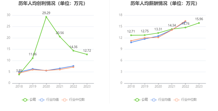 截至2023年末,公司员工总数为724人,人均创收113.05万元,人均创利12.72万元,人均薪酬15.96万元,较上年同期分别变化12.08%、-11.40%、8.13%。