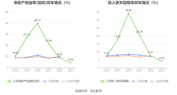 数据显示,2023年公司加权平均净资产收益率为4.59%,较上年同期下降4.70个百分点;公司2023年投入资本回报率为4.18%,较上年同期下降3.59个百分点。