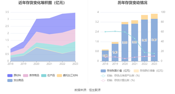 从存货变动来看,截至2023年年末,公司存货账面价值为3.47亿元,占净资产的16.01%,较上年末增加633.56万元。其中,存货跌价准备为4068.27万元,计提比例为10.49%。