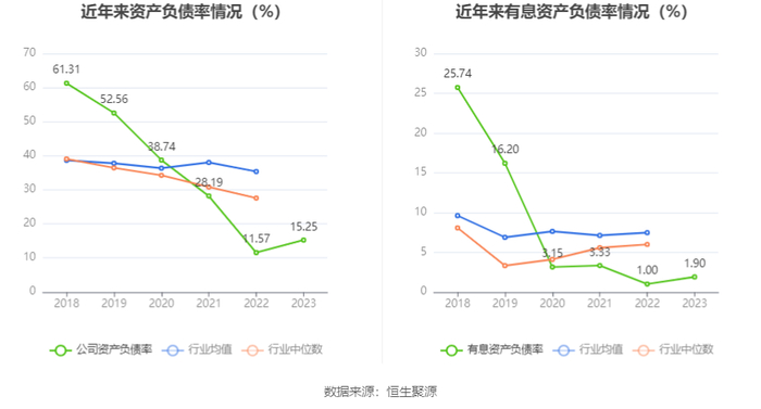 在偿债能力方面,公司2023年年末资产负债率为15.25%,相比上年末上升3.68个百分点;有息资产负债率为1.90%,相比上年末上升0.90个百分点。