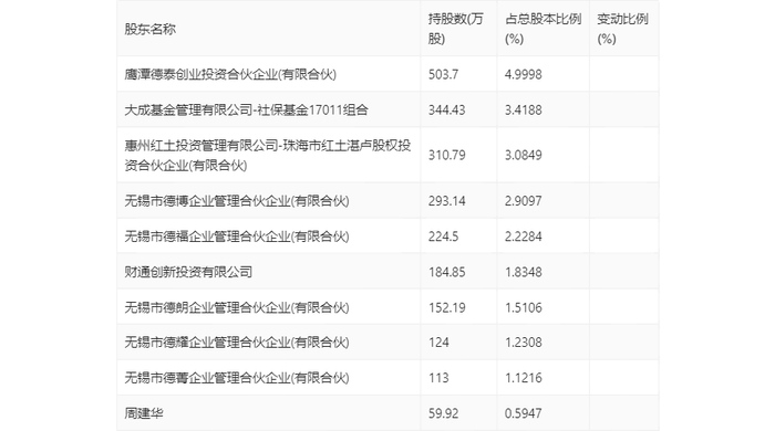 年报显示,2023年年末公司十大流通股东中,新进股东为惠州红土投资管理有限公司-珠海市红土湛卢股权投资合伙企业(有限合伙)、周建华,取代了三季度末的湖北凯辉股权投资管理有限公司-苏州凯辉成长投资基金合伙企业(有限合伙)、琦轩乘时顺势3号私募证券投资基金。在具体持股比例上,大成基金管理有限公司-社保基金17011组合持股有所上升,无锡市德博企业管理合伙企业(有限合伙)、财通创新投资有限公司、无锡市德朗企业管理合伙企业(有限合伙)、无锡市德菁企业管理合伙企业(有限合伙)持股有所下降。