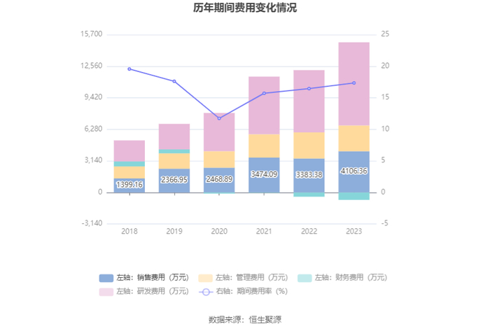 2023年,公司期间费用为1.42亿元,较上年同期增加2449.77万元;期间费用率为17.35%,较上年同期上升0.89个百分点。其中,销售费用同比增长21.37%,管理费用同比下降1.28%,研发费用同比增长33.52%,财务费用由去年同期的-419.97万元变为-735.80万元。
