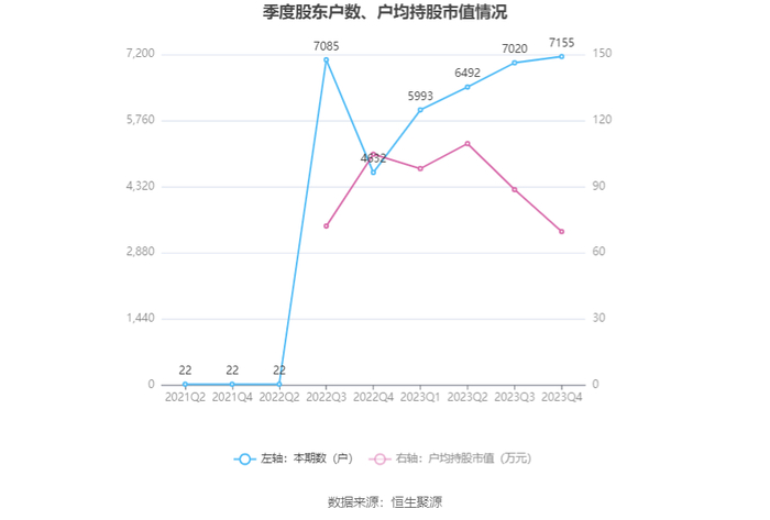 筹码集中度方面,截至2023年年末,公司股东总户数为7155户,较三季度末增长了135户,增幅1.92%;户均持股市值由三季度末的88.70万元下降至69.67万元,降幅为21.45%。