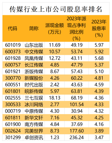 截至4月25日,浙版传媒所属的传媒行业共有91家公司公布了2023年度分配方案,浙版传媒股派现总额及股息率均居于行业前列。中金公司对此表示,公司有望保持分红金额稳定性,分红比例或继续提升,维持跑赢行业评级。
