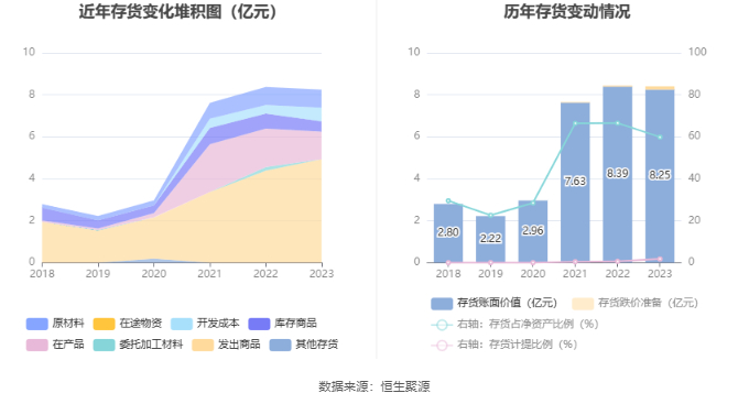 从存货变动来看,截至2023年年末,公司存货账面价值为8.25亿元,占净资产的59.85%,较上年末减少1381.23万元。其中,存货跌价准备为1467.06万元,计提比例为1.75%。
