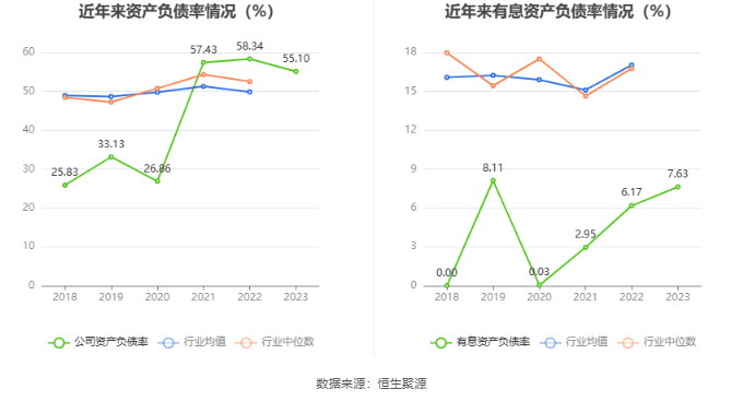 在偿债能力方面,公司2023年年末资产负债率为55.10%,相比上年末下降3.24个百分点;有息资产负债率为7.63%,相比上年末上升1.46个百分点。