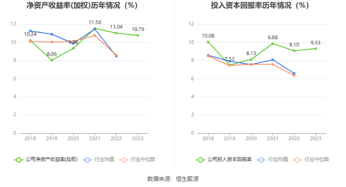 数据显示,2023年公司加权平均净资产收益率为10.79%,较上年同期下降0.25个百分点;公司2023年投入资本回报率为9.33%,较上年同期增长0.23个百分点。