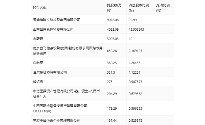 值得注意的是,根据年报数据,音飞储存15.00%股份处于质押状态。其中,第一大股东景德镇陶文旅控股集团有限公司质押4509.04万股公司股份,占其全部持股的50.00%。