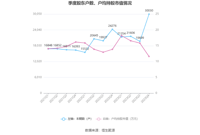 筹码集中度方面,截至2023年年末,公司股东总户数为3万户,较三季度末增长了1.03万户,增幅52.44%;户均持股市值由三季度末的15.84万元下降至11.62万元,降幅为26.64%。