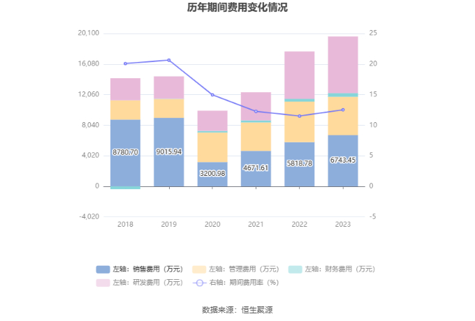 2023年,公司期间费用为1.97亿元,较上年同期增加1968.71万元;期间费用率为12.53%,较上年同期上升1.02个百分点。其中,销售费用同比增长15.89%,管理费用同比下降5.6%,研发费用同比增长19.56%,财务费用同比增长34.03%。
