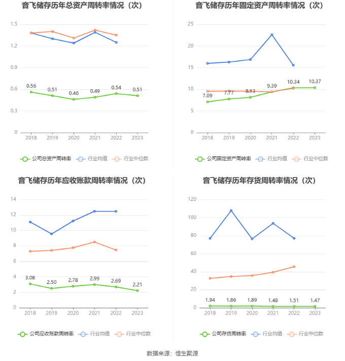 营运能力方面,2023年,公司公司总资产周转率为0.51次,上年同期为0.54次(2022年行业平均值为1.25次,公司位居同行业38/46);固定资产周转率为10.37次,上年同期为10.34次(2022年行业平均值为15.55次,公司位居同行业23/46);公司应收账款周转率、存货周转率分别为2.21次、1.47次。