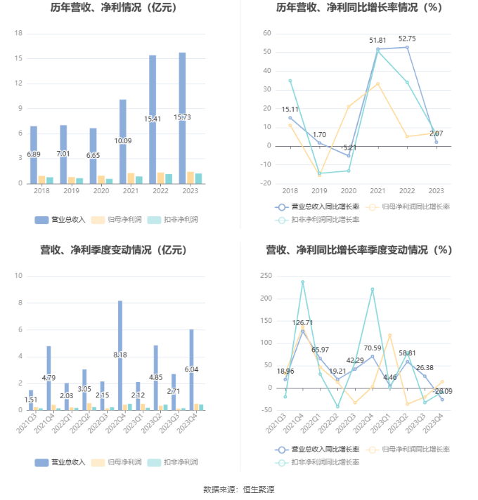 2023年,公司经营活动现金流净额为6063.74万元,同比下降8.98%;筹资活动现金流净额278.59万元,同比减少7437.58万元;投资活动现金流净额-459.05万元,上年同期为-4.54亿元。