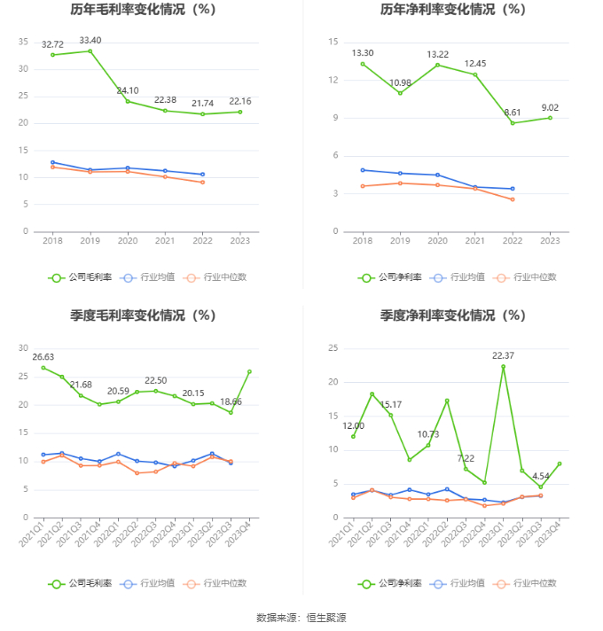 2023年,公司毛利率为22.16%,同比上升0.42个百分点;净利率为9.02%,较上年同期上升0.41个百分点。从单季度指标来看,2023年第四季度公司毛利率为25.93%,同比上升4.33个百分点,环比上升7.27个百分点;净利率为7.99%,较上年同期上升2.79个百分点,较上一季度上升3.45个百分点。