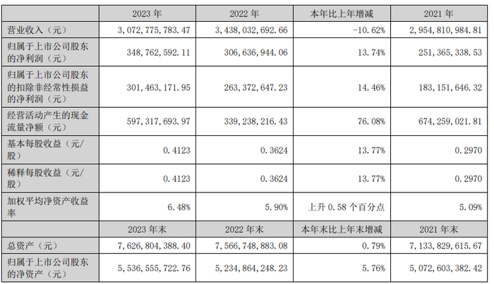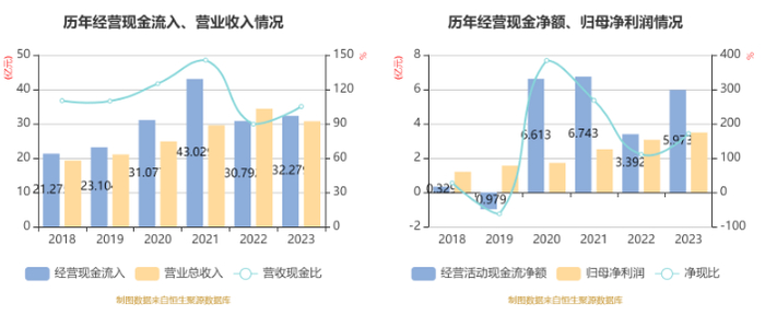 2023年,公司经营活动现金流净额为5.97亿元,同比增长76.08%;筹资活动现金流净额-9953.18万元,同比增加4109.57万元;投资活动现金流净额-2218.95万元,上年同期为-7.78亿元。