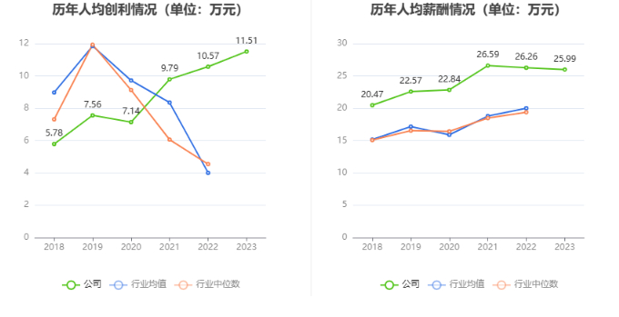 截至2023年末,公司员工总数为3030人,人均创收101.41万元,人均创利11.51万元,人均薪酬25.99万元,较上年同期分别变化-14.43%、8.90%、-1.00%。