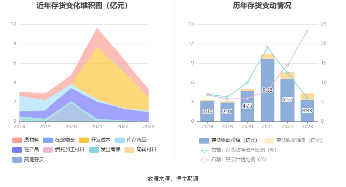 从存货变动来看,截至2023年年末,公司存货账面价值为3.33亿元,占净资产的6.02%,较上年末减少3.23亿元。其中,存货跌价准备为1.02亿元,计提比例为23.47%。