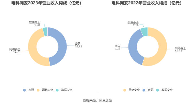 分产品来看,2023年公司主营业务中,密码收入14.75亿元,同比增长10.45%,占营业收入的47.99%;网络安全收入14.70亿元,同比下降21.96%,占营业收入的47.84%;数据安全收入1.28亿元,同比下降41.54%,占营业收入的4.17%。