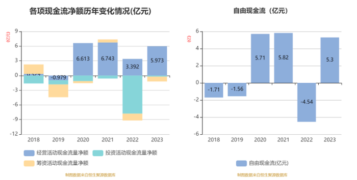 进一步统计发现,2023年公司自由现金流为5.30亿元,上年同期为-4.54亿元。