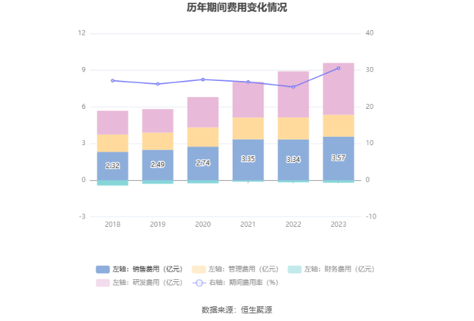 2023年,公司期间费用为9.39亿元,较上年同期增加6369.32万元;期间费用率为30.55%,较上年同期上升5.10个百分点。其中,销售费用同比增长6.76%,管理费用同比下降0.69%,研发费用同比增长12.09%,财务费用由去年同期的-1647.95万元变为-1977.11万元。