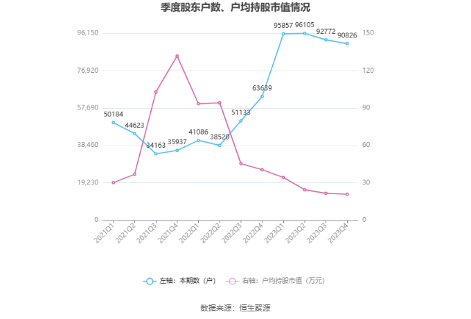 筹码集中度方面,截至2023年年末,公司股东总户数为9.08万户,较三季度末下降了1946户,降幅2.10%;户均持股市值由三季度末的21.68万元下降至20.91万元,降幅为3.55%。