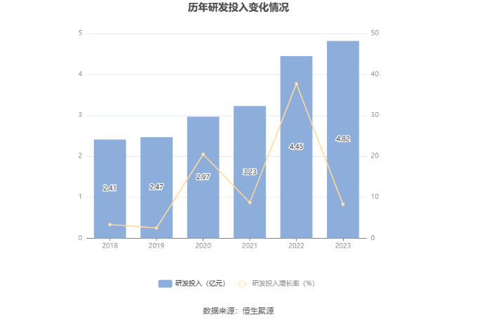 2023年全年,公司研发投入金额为4.82亿元,同比增长8.27%;研发投入占营业收入比例为15.68%,相比上年同期上升2.73个百分点。此外,公司全年研发投入资本化率为12.24%。