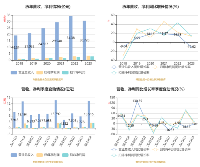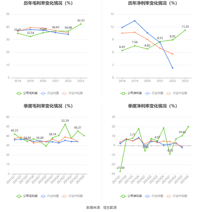 2023年,公司毛利率为42.33%,同比上升5.65个百分点;净利率为11.25%,较上年同期上升2.30个百分点。从单季度指标来看,2023年第四季度公司毛利率为40.52%,同比下降0.13个百分点,环比下降4.79个百分点;净利率为20.03%,较上年同期上升1.38个百分点,较上一季度上升9.61个百分点。