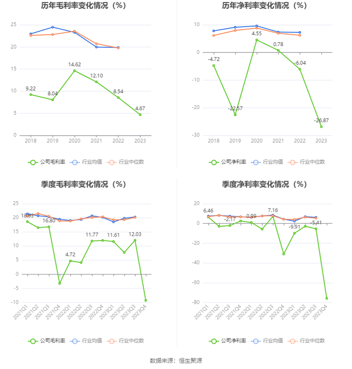 2023年,公司毛利率为4.67%,同比下降3.87个百分点;净利率为-26.87%,较上年同期下降20.83个百分点。从单季度指标来看,2023年第四季度公司毛利率为-9.29%,同比下降21.27个百分点,环比下降21.32个百分点;净利率为-75.88%,较上年同期下降44.90个百分点,较上一季度下降70.47个百分点。