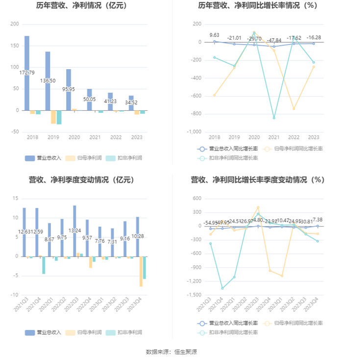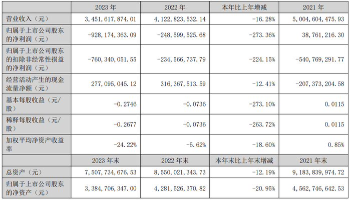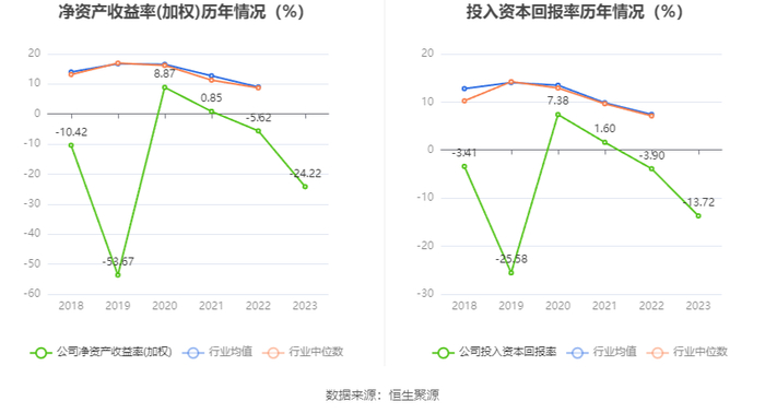 数据显示,2023年公司加权平均净资产收益率为-24.22%,较上年同期下降18.60个百分点;公司2023年投入资本回报率为-13.72%,较上年同期下降9.82个百分点。