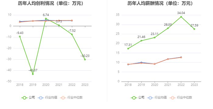 截至2023年末,公司员工总数为3070人,人均创收112.43万元,人均创利-30.23万元,人均薪酬27.59万元,较上年同期分别下降9.82%、302.18%、18.94%。