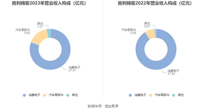 分产品来看,2023年公司主营业务中,消费电子收入27.91亿元,同比下降25.69%,占营业收入的80.86%;汽车零部件收入5.60亿元,同比增长82.95%,占营业收入的16.21%。