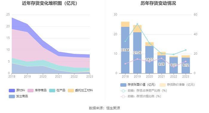 从存货变动来看,截至2023年年末,公司存货账面价值为8.12亿元,占净资产的23.99%,较上年末减少2089.64万元。其中,存货跌价准备为1.13亿元,计提比例为12.26%。