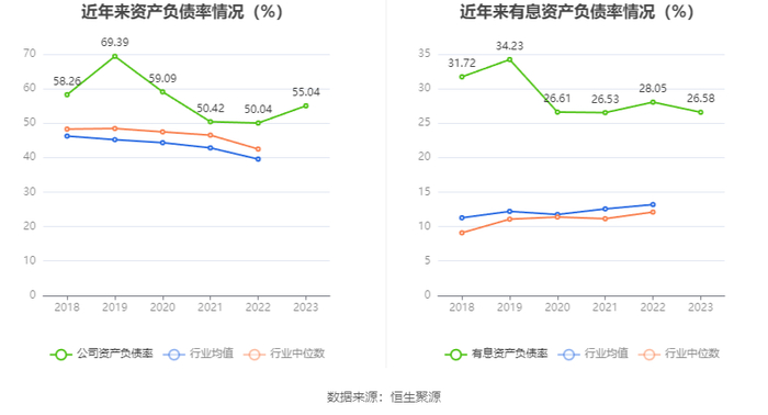 在偿债能力方面,公司2023年年末资产负债率为55.04%,相比上年末上升5.00个百分点;有息资产负债率为26.58%,相比上年末下降1.47个百分点。