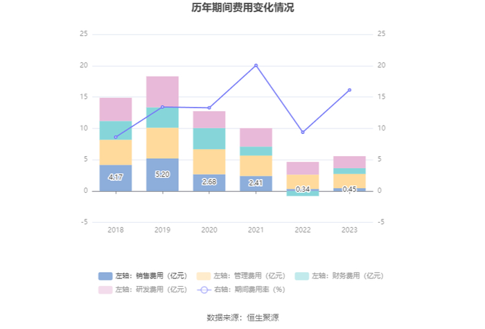 2023年,公司期间费用为5.57亿元,较上年同期增加1.70亿元;期间费用率为16.12%,较上年同期上升6.74个百分点。其中,销售费用同比增长30.9%,管理费用同比增长0.31%,研发费用同比下降5.39%,财务费用由去年同期的-7881.29万元变为9053.90万元。