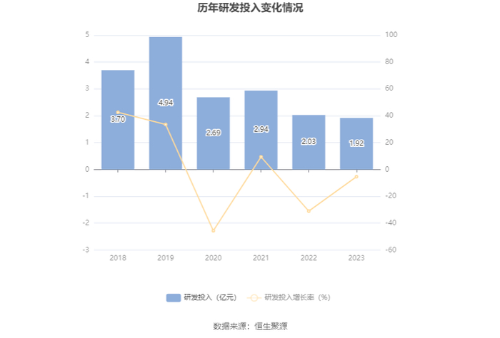 2023年全年,公司研发投入金额为1.92亿元,同比下降5.39%;研发投入占营业收入比例为5.57%,相比上年同期上升0.65个百分点。此外,公司全年研发投入资本化率为0。