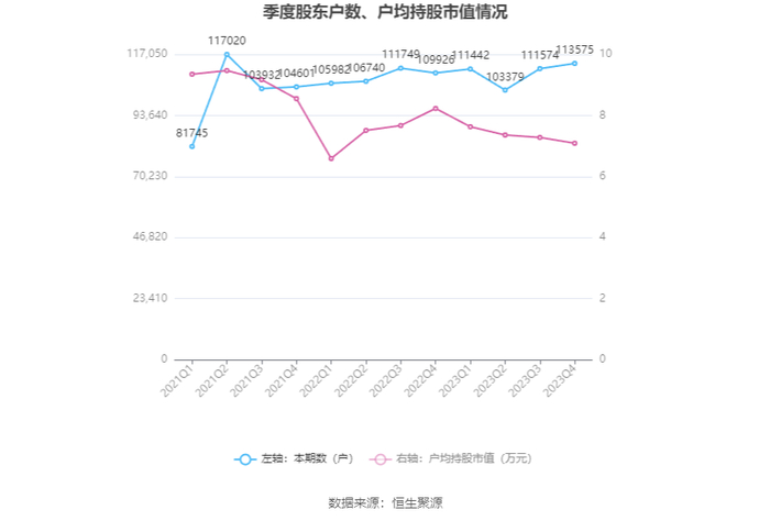 筹码集中度方面,截至2023年年末,公司股东总户数为11.36万户,较三季度末增长了2001户,增幅1.79%;户均持股市值由三季度末的7.28万元下降至7.09万元,降幅为2.61%。