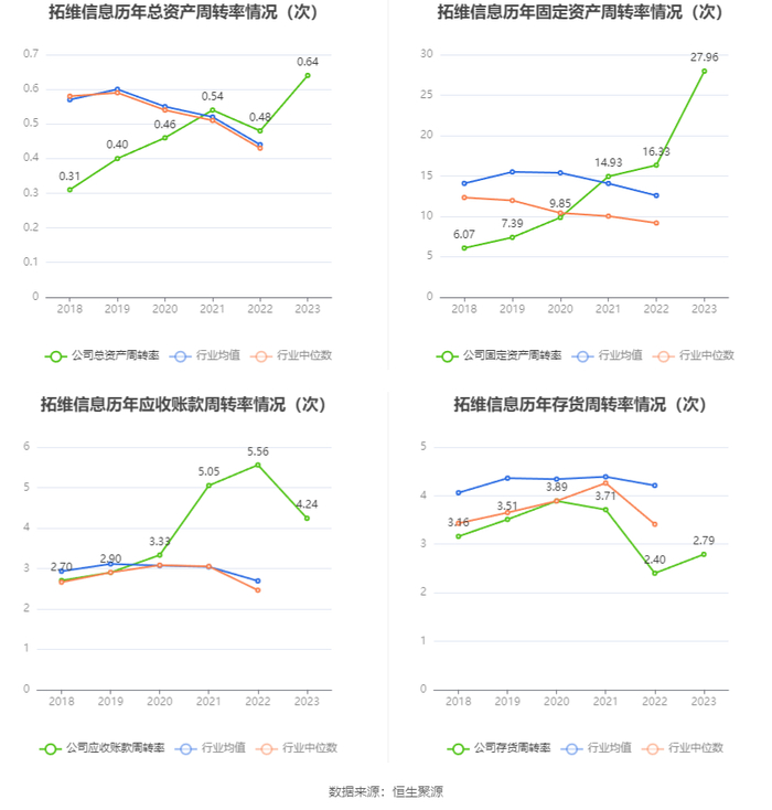 营运能力方面,2023年,公司公司总资产周转率为0.64次,上年同期为0.48次(2022年行业平均值为0.44次,公司位居同行业43/103);固定资产周转率为27.96次,上年同期为16.33次(2022年行业平均值为12.57次,公司位居同行业33/103);公司应收账款周转率、存货周转率分别为4.24次、2.79次。