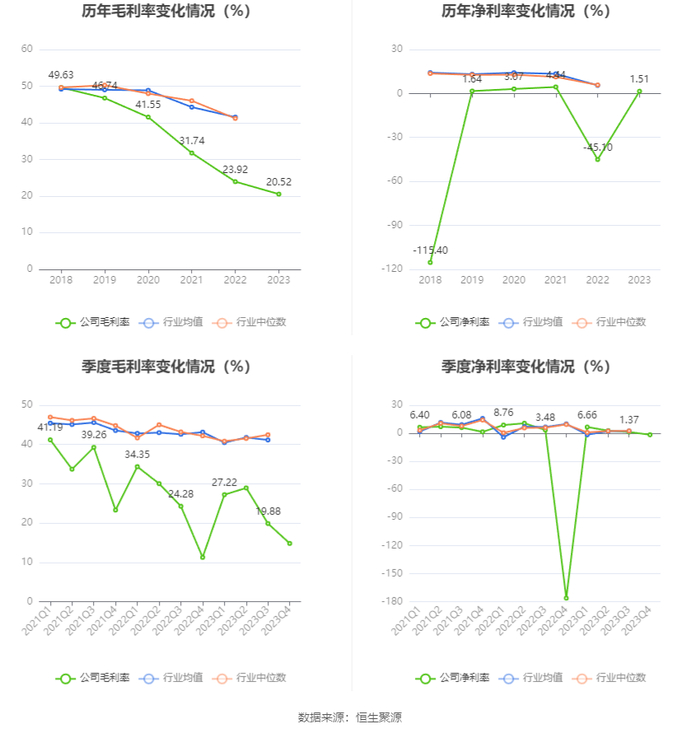 2023年,公司毛利率为20.52%,同比下降3.40个百分点;净利率为1.51%,较上年同期上升46.61个百分点。从单季度指标来看,2023年第四季度公司毛利率为14.81%,同比上升3.54个百分点,环比下降5.07个百分点;净利率为-1.58%,较上年同期上升174.69个百分点,较上一季度下降2.95个百分点。