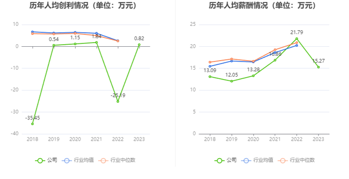 截至2023年末,公司员工总数为5459人,人均创收57.78万元,人均创利0.82万元,人均薪酬15.27万元,较上年同期分别变化3.85%、103.27%、-29.91%。