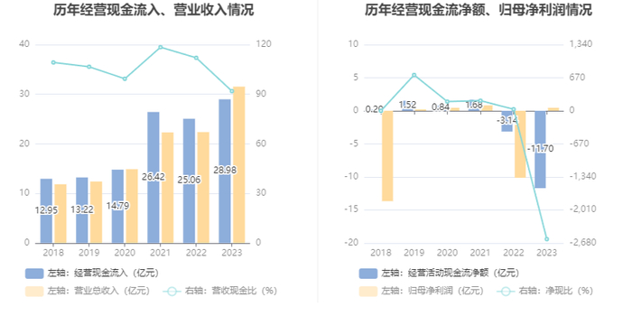 2023年,公司经营活动现金流净额为-11.70亿元,同比减少8.56亿元;筹资活动现金流净额10.66亿元,同比增加8.10亿元;投资活动现金流净额3.97亿元,上年同期为-1.57亿元。