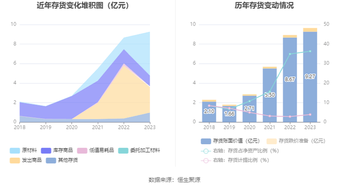 从存货变动来看,截至2023年年末,公司存货账面价值为9.27亿元,占净资产的36.34%,较上年末增加5963.68万元。其中,存货跌价准备为3775.13万元,计提比例为3.91%。