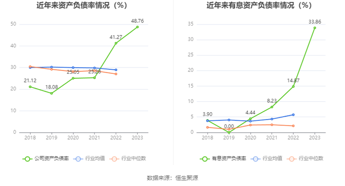 在偿债能力方面,公司2023年年末资产负债率为48.76%,相比上年末上升7.49个百分点;有息资产负债率为33.86%,相比上年末上升18.99个百分点。