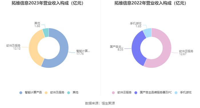 分产品来看,2023年公司主营业务中,智能计算产品收入17.76亿元,同比增长120.61%,占营业收入的56.31%;软件及服务收入12.12亿元,同比下降4.33%,占营业收入的38.42%。
